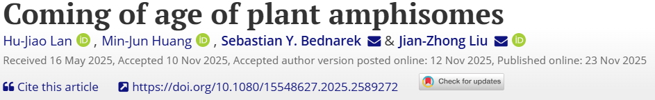 近日,浙江师范大学生命科学学院刘建中课题组在国际著名期刊 Autophagy 发表了题为“Coming of age of plant amphisomes”的综述性文章。Autophagy 是一本专注于细胞生物学领域的国际学术期刊,由 Taylor & Francis Group 出版,为 SCI 一区 Top 期刊,最新影响因子为14.3,五年影响因子为17.1。