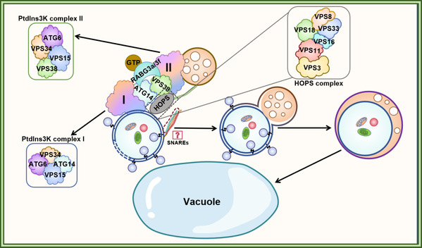 PtdIns3KC3-I复合体中的ATG14亚基与PtdIns3KC3-II复合体中的VPS38亚基之间的相互作用桥接自噬体与多囊泡内体之间融合形成两性体。该两性体的形成同时需要RABG3a/RABG3f以及HOPS复合体的参与。