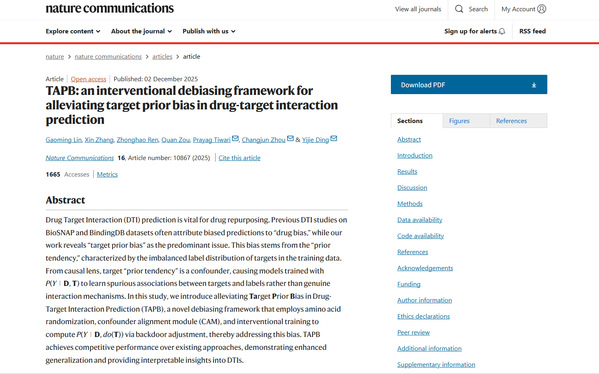 近日,浙江师范大学计算机科学与技术学院在人工智能驱动的药物发现领域取得一项标志性成果。周昌军教授及其2024级博士研究生林高铭(第一作者),联合瑞典 Halmstad University 的 Prayag Tiwari 教授、电子科技大学长三角研究院(衢州)的邹权教授与丁漪杰研究员等合作完成的学术论文“ TAPB: an interventional debiasing framework for alleviating target prior bias in drug-target interaction prediction ”已于12月2日在 Nature Communications 上在线发表。该成果是计算机科学与技术学院首次以第一完成单位在 Nature 子刊上发表论文。